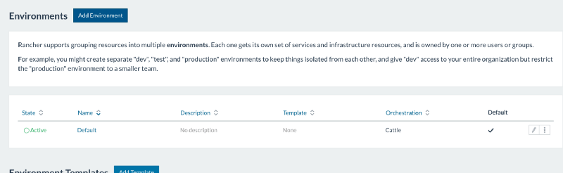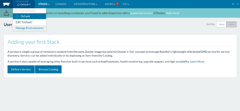 Rancher comes with a Default environment once you installed to your system. This environment uses Cattle for orchestration. We will create another environment to create all the things from scratch. Go to Manage Environment > Add Environmnet