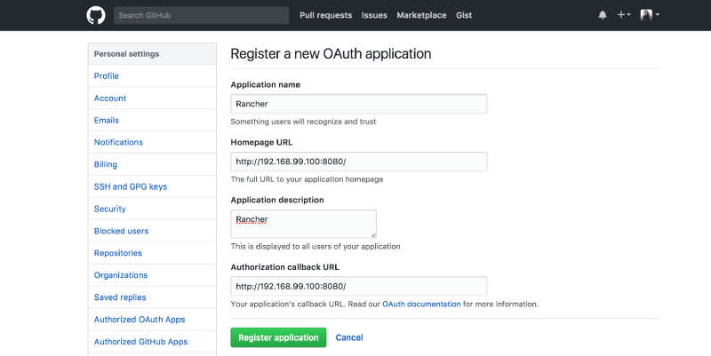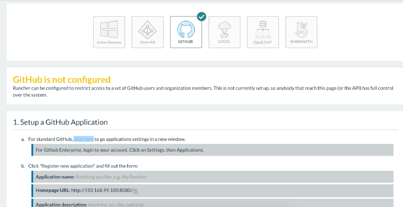 Most probably, the first thing you want to do is adding authentication / authorisation system to your Rancher UI. On main menu, you will see a warning indicator on Admin menu. In this tutorial, we will continue with Github login. For Github login, you will need a Github application. To create an application, please follow instruction on that screen.