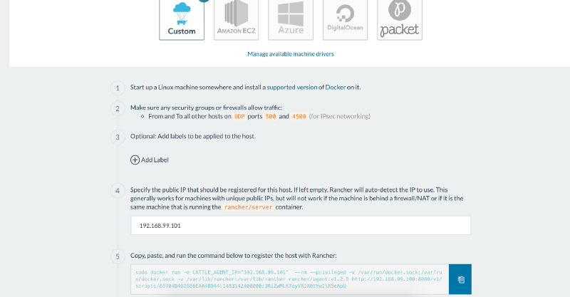 We have already created an environment on previous stem and when you go to that environment, you will see a message on header that warns you to Add Host. Click that link and select Custom. Get the ip address of your rancher host with following;