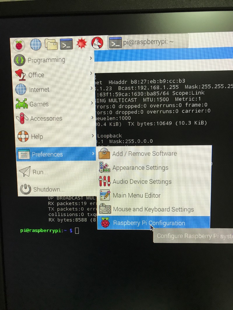OS installation is finished and we are able to connect to Raspberry Pi. In order to do that, we need to allow SSH connection first. Go to Raspberry Pi > Preferences > Raspberry Pi Configuration.